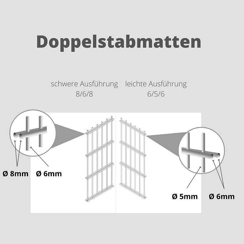 Doppelstabmatten bestehen aus massiven, maschinell verschweißten Stahldrähten. Sie besitzen doppelte parallel verlaufende Horizontaldrähte und senkrechte Einzeldrähte. Durch diese Konstellation erhält der Zaun eine optimale Stabilität und langfristige Haltbarkeit bei günstigem Preis.